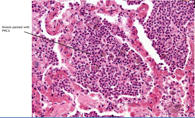 Bronchiolitis - demonstrates exudation of PML’s into the adjacent alveoli