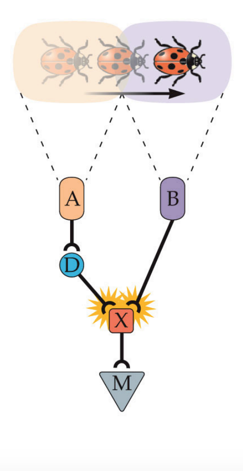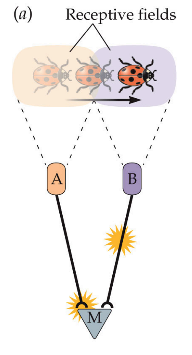 No, the information from two receptive fields arrives at different times. For the circuit to be able to detect motion, we must introduce a delay at axon A (see the example below).