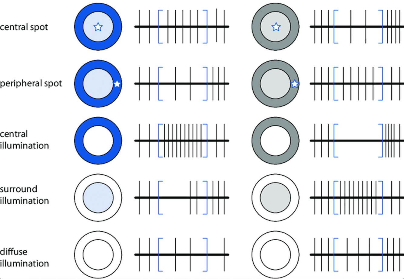 Left - an on-center off-surround receptive field. Increases the firing rate when the light covers the center of the field.