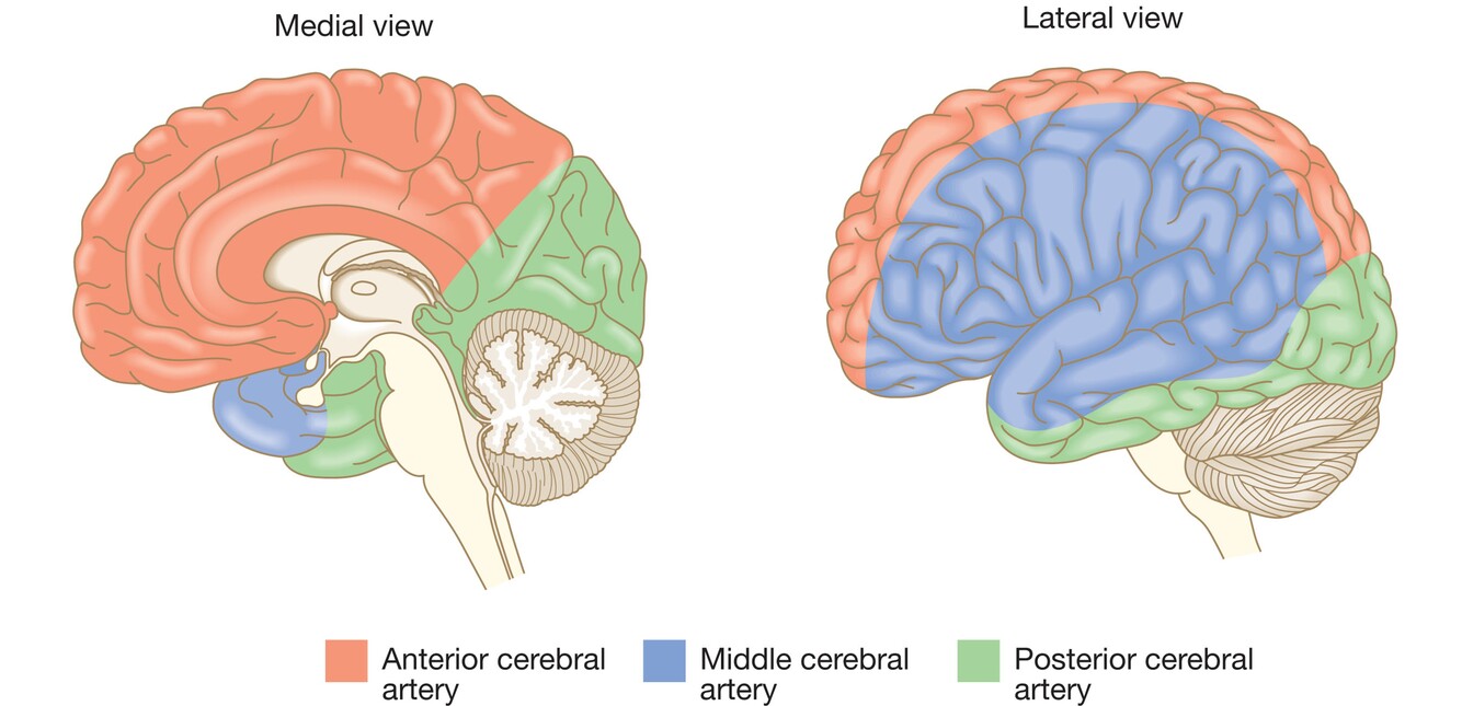 Describe the parts of the brain supplied by the anterior, middle and posterior cerebral arteries?