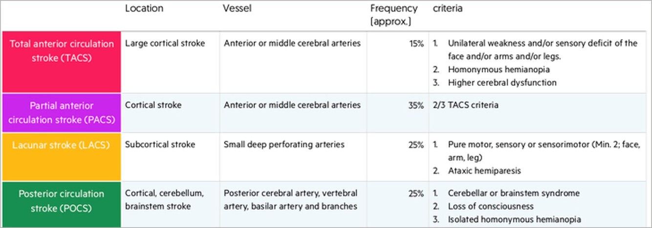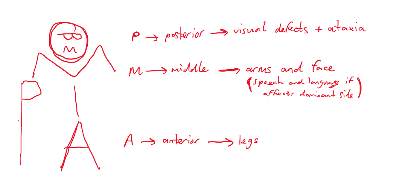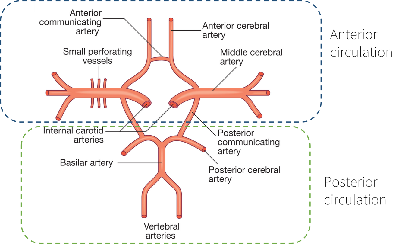 For example an occlusion in the internal corotid artery would affect the anterior circulation whereas if it was higher up in the anterior cerebral artery it would just be the anterior cerebral artery