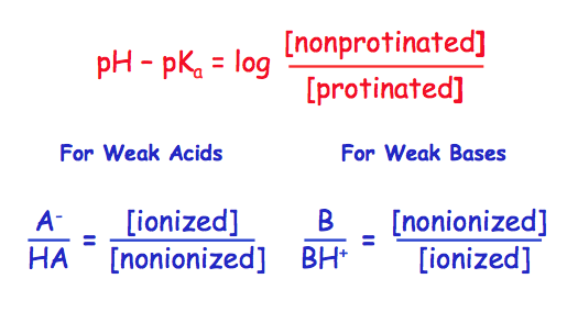 So if we know the pH we can calcualte the concentrations of inoized and neutral forms of weak acids and weak bases..