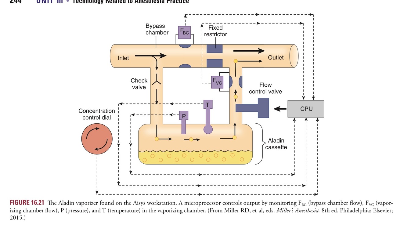 The operator can set the concentration of the anesthetic on the vaporizer. This causes a portion of the combined gases from the flowmeter to be channeled down to the vaporizing chamber, while the rest of the gas (majority) doesn’t come into contact with the vaporized anesthetic at all, going through the bypass chamber.