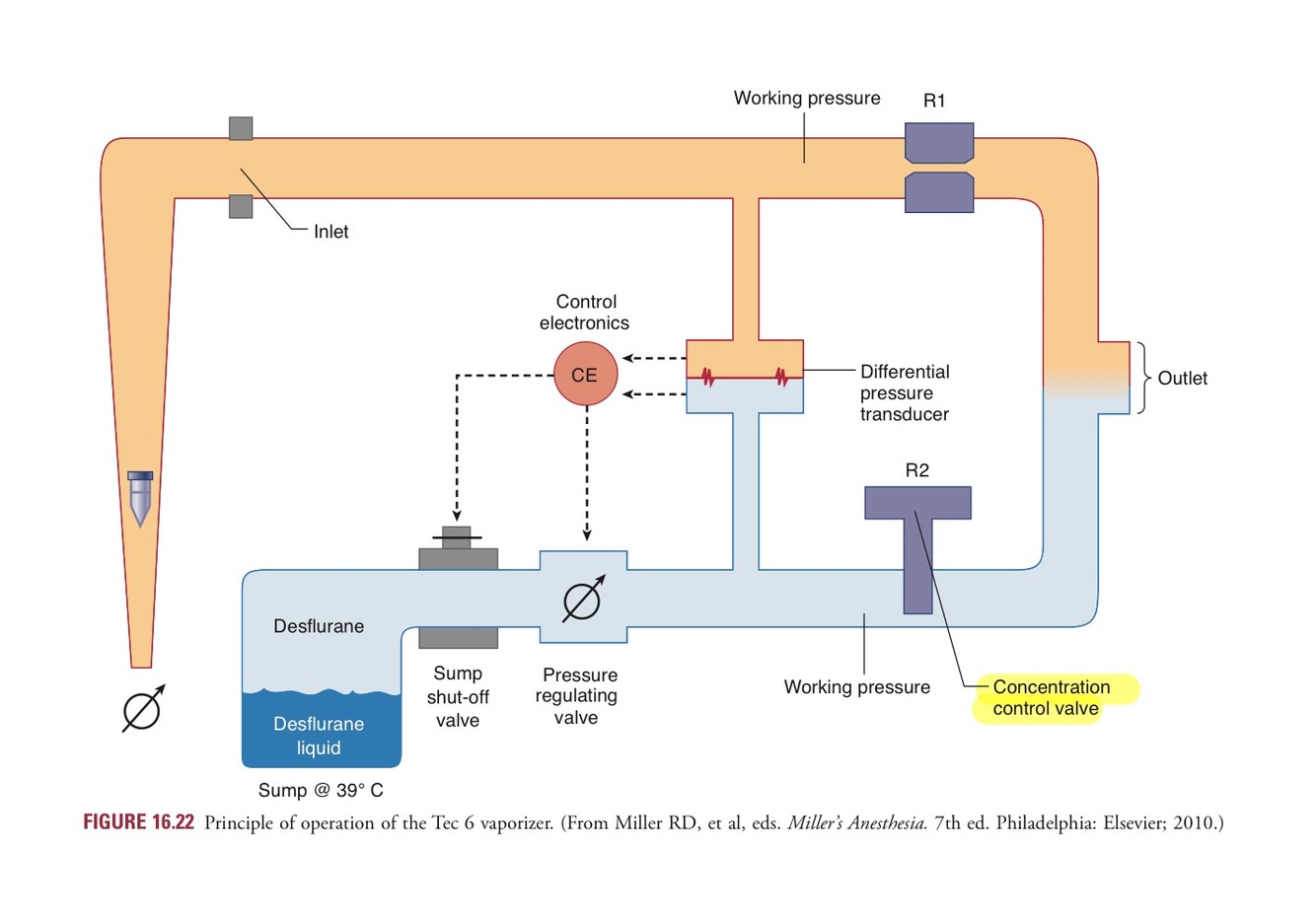 Tec 6 is used only with Desflurane, where it is heated and pressurized (due to vapor pressure being so close to atmospheric pressure). Heated dual circuit vaporizer where the FGF NEVER comes in contact with the anesthetic vapor. Instead, an appropriate amount of vapor is released from the vaporizer.