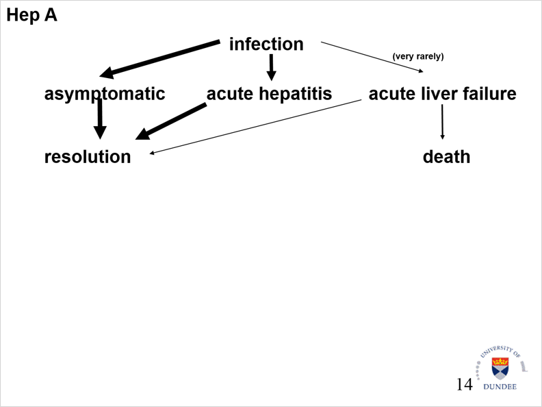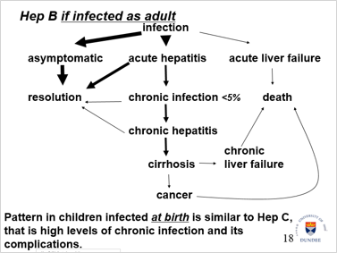 * Asymptomatic -> resolution * Acute liver failure -> death * Acute hepatitis -> resolution or chronic infection -> cirrhosis * Cirrhosis to cancer or chronic liver failure -> both to death Increasing age of infection decreases likelihood of chronic infection