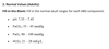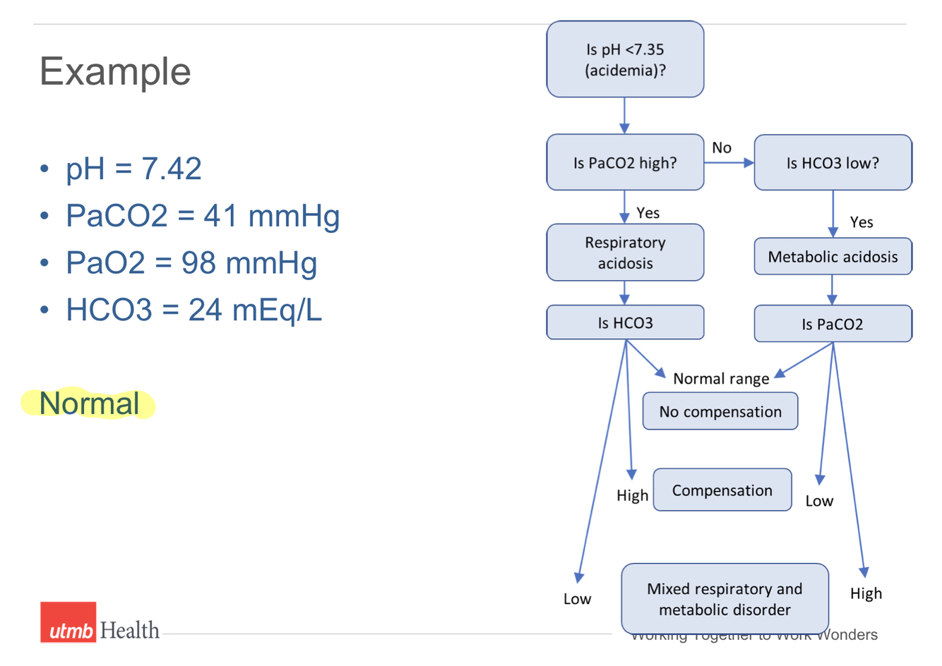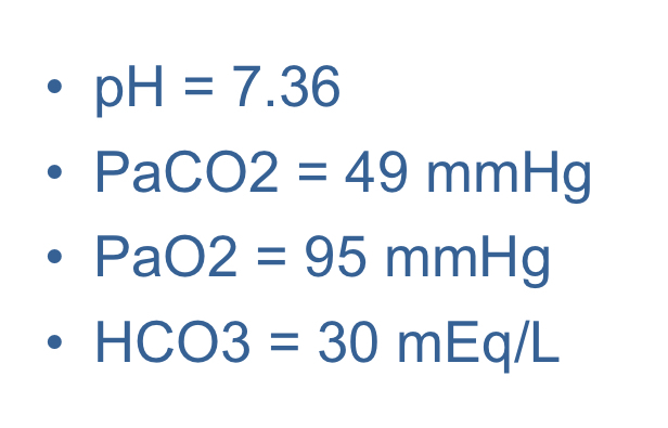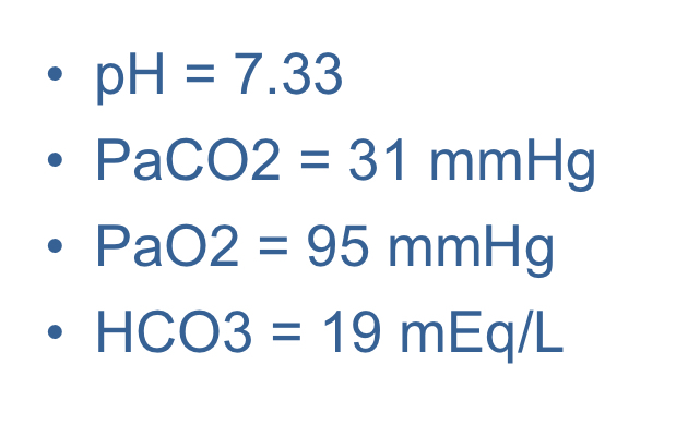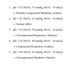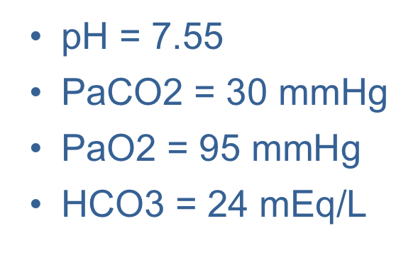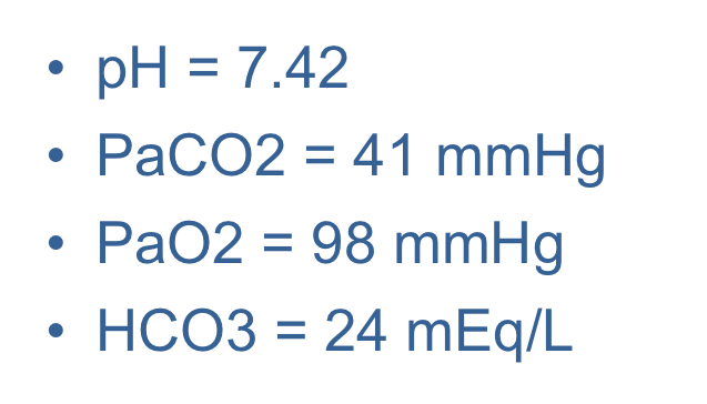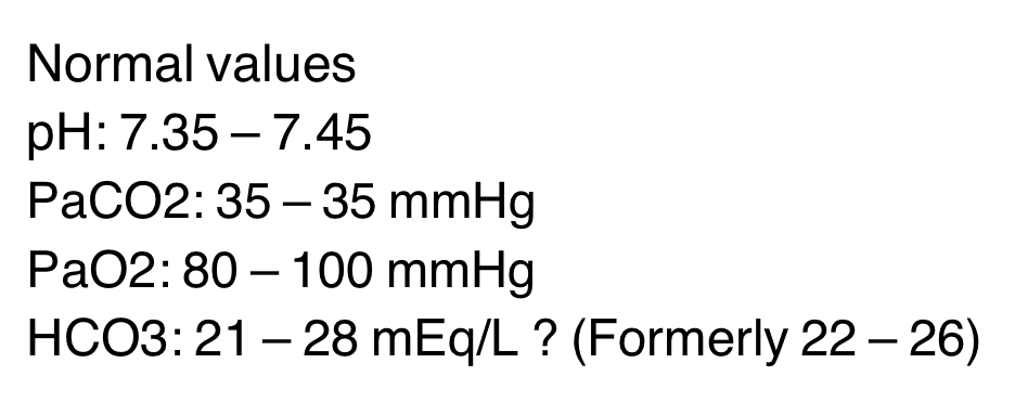 What are the norm values for: 1) pH, 2) PaCO2, 3) PaO2, 4) HCO3