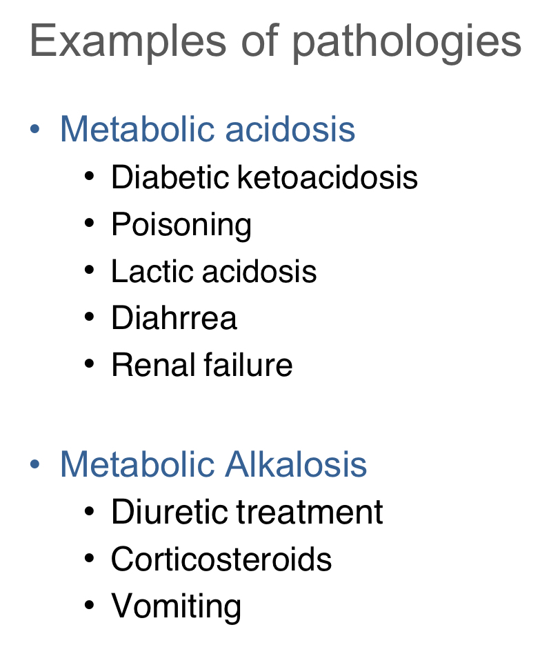 List examples of metabolic (acidosis and alkalosis) pathologies