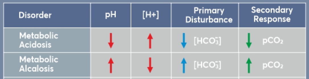 How is pH, H+, HCO-3, and PCO2 affected in metabolic acidosis vs alkalosis?