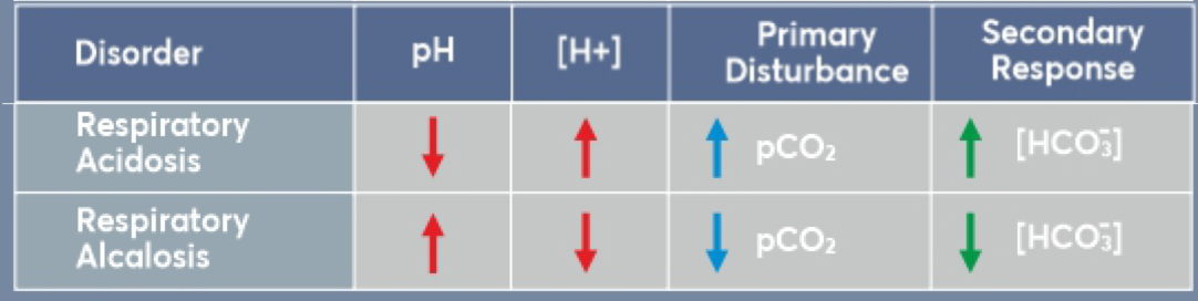 How is pH, H+, HCO-3, and PCO2 affected in respiratory acidosis vs alkalosis?