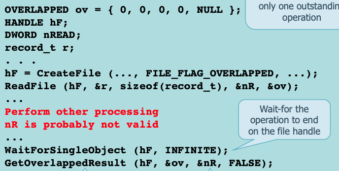then we use the file handle or the overlapped event to wait for completion.