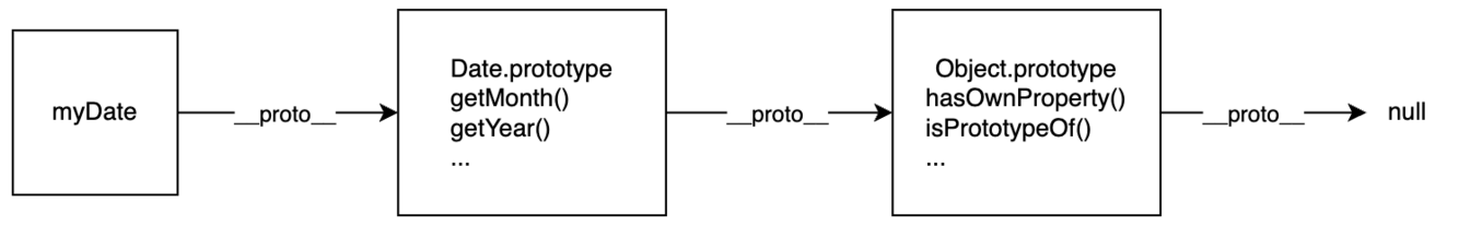 // nullThis code creates a Date object, then walks up the prototype chain, logging the prototypes. It shows us that the prototype of myDate is a Date.prototype object, and the prototype of that is Object.prototype.
