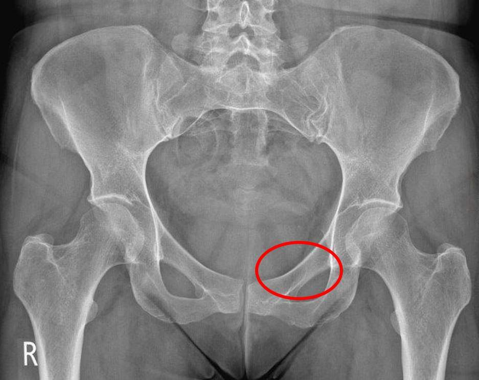 Which anatomical structure does the red circle highlight on this pelvic x-ray?