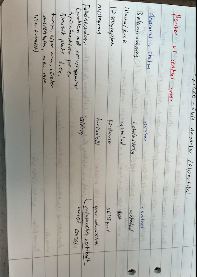 Rita en tabell över skillnaden mellan perifer och central yrsel vad gäller anamnes och statusundersökningar? (4p)