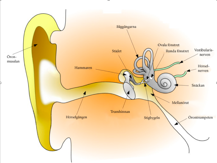 När ljud når trumhinnan börjar den vibrera, vilket gör att hammaren börjar vibrera. Hammaren har kontakt med städet som har kontakt med stigbygeln. Stigbygeln är fäst vid det ovala fönstret som är en öppning mellan mellanörat o innerörat (den grå snäckan (hela) är alltså innerörat).
