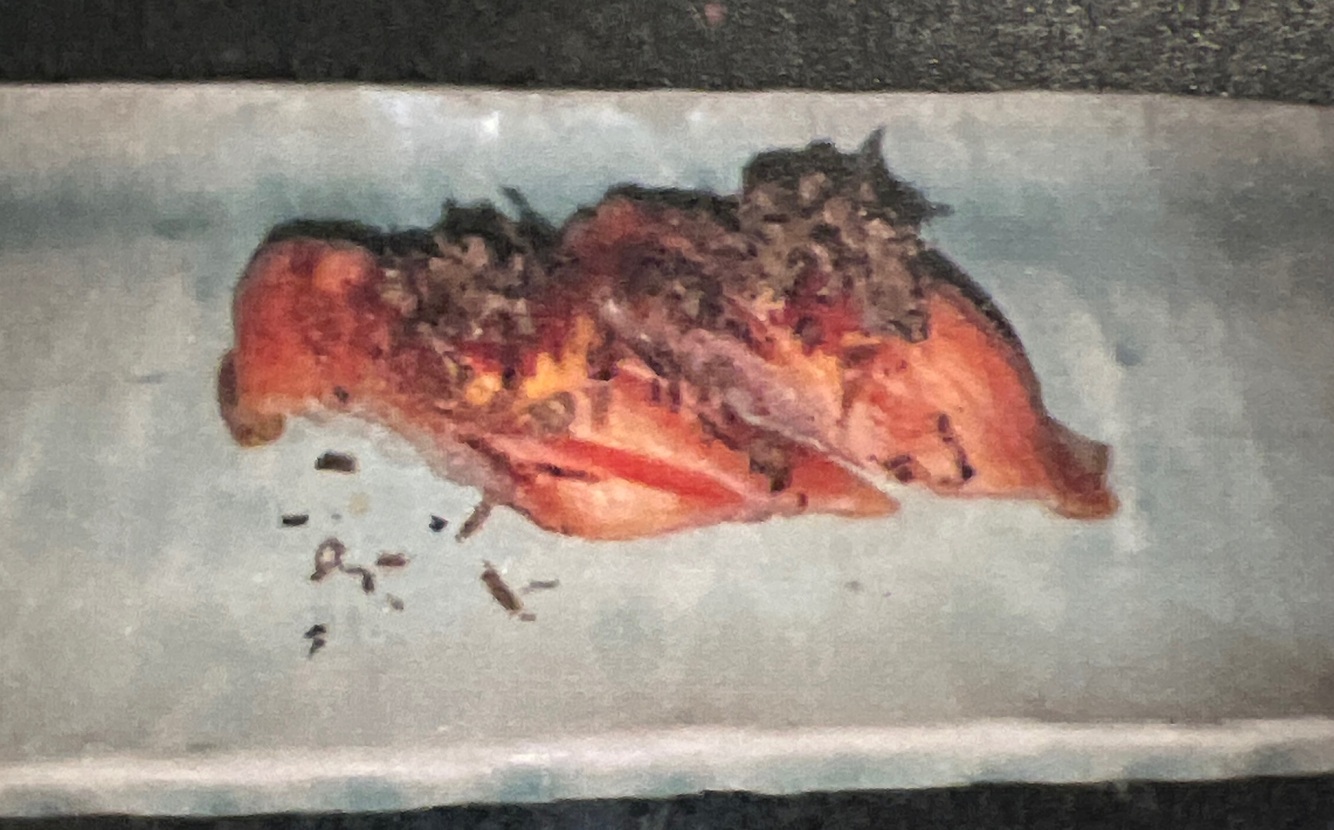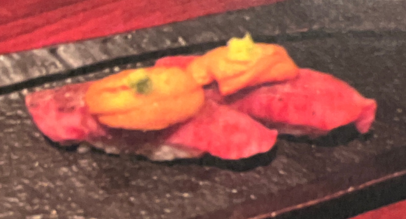 Sliced Wagyu A5 brushed with nikiri soy then torched, topped with Uni