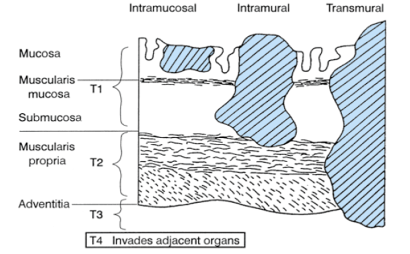 Wie sehen die einzelnen Schweregrade des Tumors aus? (T1 bis T4)